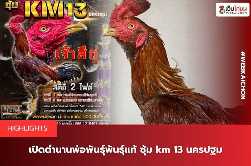 สำหรับการแข่งขันที่ดุเดือดในวงการไก่ชนพม่าชนพม่า รอติดตามกันว่าจะมีขุนพลตัวไหนออกไปอาละวาดในสนาม ชื่อเสียงและผลงานของเจ้าสีดู่ในปีนี้ไม่ธรรมดา ค่าตัว 500,000 บาท พ่อพันธุ์หลักของ KM 13 สำหรับผู้ที่สนใจฝากผสมสามารถคิดคอกละ 9,000 บาท พร้อมรับลูกไก่อายุ 50-60 วัน